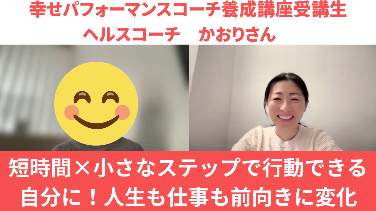 今日は幸せパフォーマンスコーチ養成講座を受講されましたヘルスコーチのかおりさんにインタビューさせていただきました。かおりさんありがとうございました。