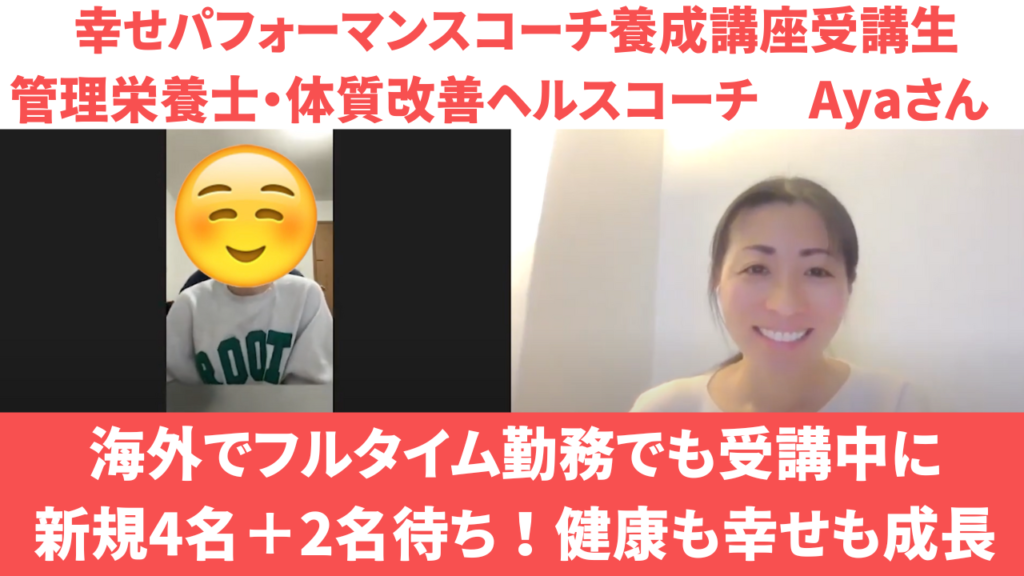 海外でフルタイム勤務でも受講中に新規4名+2名待ち!健康も幸せも成長!幸せパフォーマンスコーチ養成講座受講生 管理栄養士・体質改善ヘルスコーチ Ayaさん