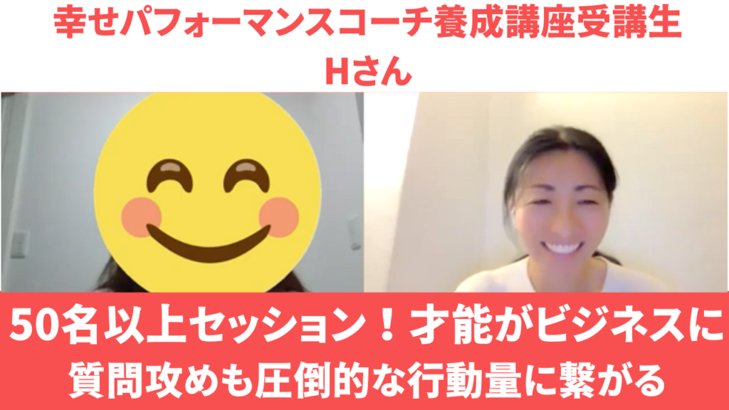 【50名以上セッション】才能がビジネスに。質問攻めも圧倒的な行動量に繋がる!幸せパフォーマンスコーチ養成講座受講生 Hさん