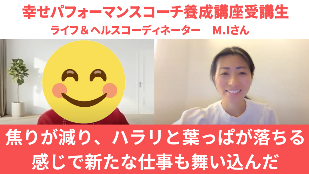 焦りが減り、ハラリと葉っぱが落ちる感じで新たな仕事も舞い込んだ 幸せパフォーマンスコーチ養成講座受講生 ライフ&ヘルスコーディネーター M.Iさん