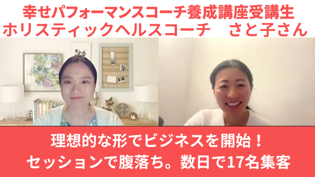 理想的な形でビジネスを開始。個別セッションの言葉で腹落ち、数日で17名!幸せパフォーマンスコーチ養成講座 受講生 ホリスティックヘルスコーチ さと子さん