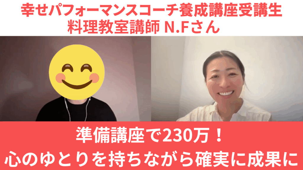 準備講座で230万!心のゆとりを持ちながら確実に成果に 幸せパフォーマンスコーチ養成講座受講生 料理教室講師 N.Fさん