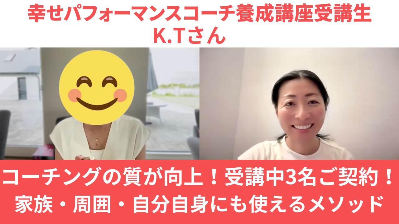今回は、ホリスティック栄養学の考えをもとに、セルフコーチング・コーチング・栄養指導・ビジネスが学べる「幸せパフォーマンスコーチ養成講座」の受講生K.Tさんのインタビューをご紹介します。