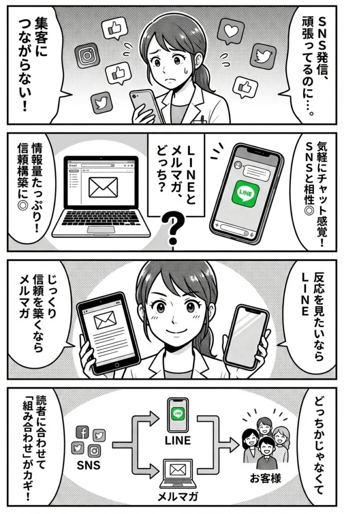 私の場合は、LINEとメルマガ両方を用途に応じて使い分けしています。
