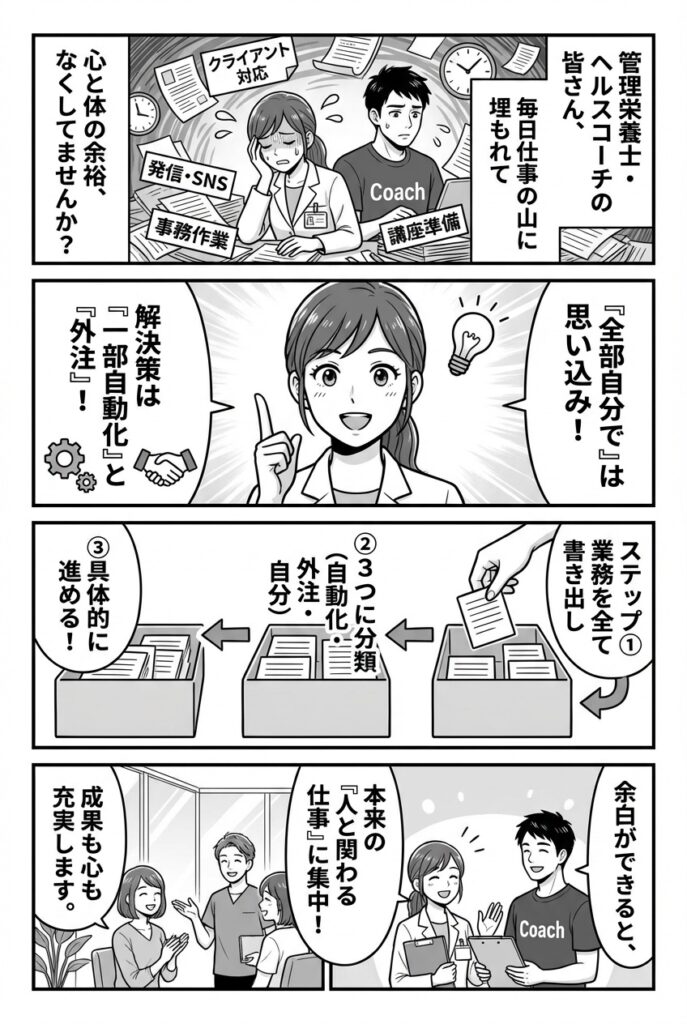 今回は、管理栄養士・ヘルスヘルスコーチ、ウェルネス専門家が知っておきたい、心と体の余白を作る働き方、一部自動化と外注のステップを解説します。