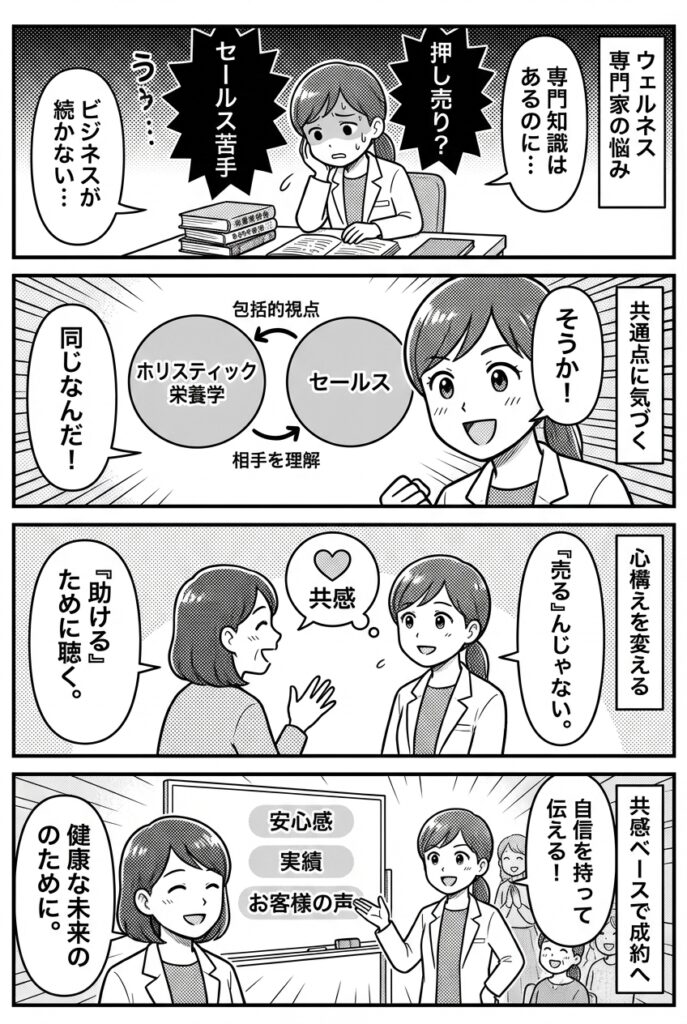 管理栄養士・ヘルスコーチ、その他ウェルネス専門家として活動する人は、もともと相手の状況に寄り添う力を持っています。その姿勢をセールスに取り入れるだけで、“押し売り”から“共感”へと自然に変わります。